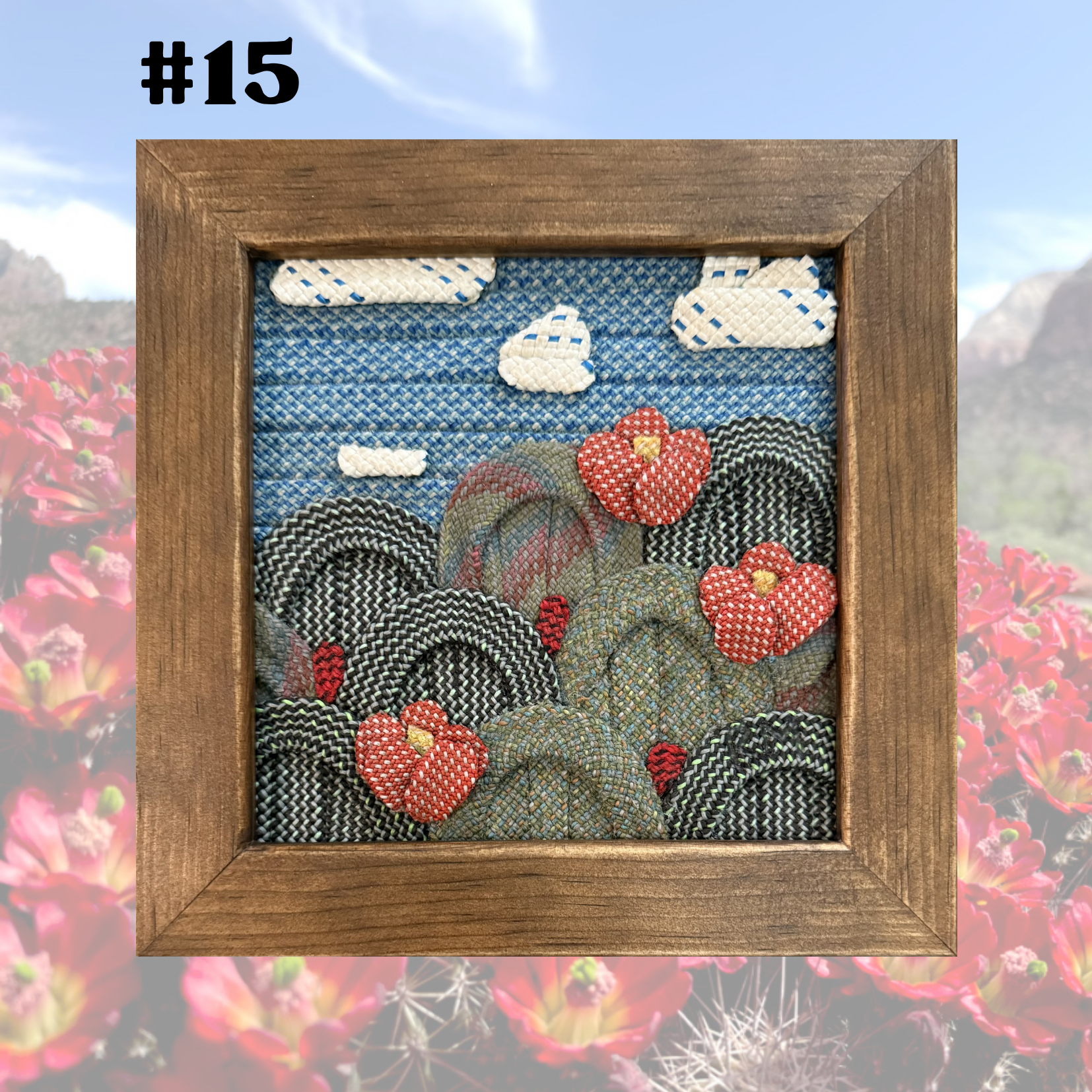 A fan favorite! The claret cup cactus flowering is quite a sight to see. Each piece is made slightly different so you know you are still getting a unique original artwork! Plus the rope colors only can make a certain number of pieces, so once that color is gone, it's gone for good!